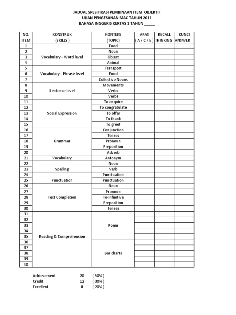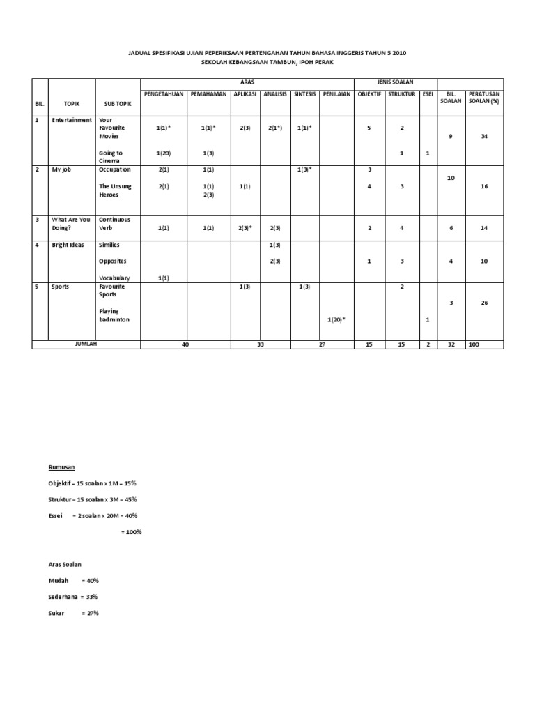 However the peace and prosperity of our nation must be well-balanced and maintained in order to address this issue. TEST TABLE OF SPECIFICATION ENGLISH LEVEL 2 YEAR 4 2018 SEKOLAH KEBANGSAAN SUNGAI BATU Examination. 2 Menganalisis objektif pelajaran.
